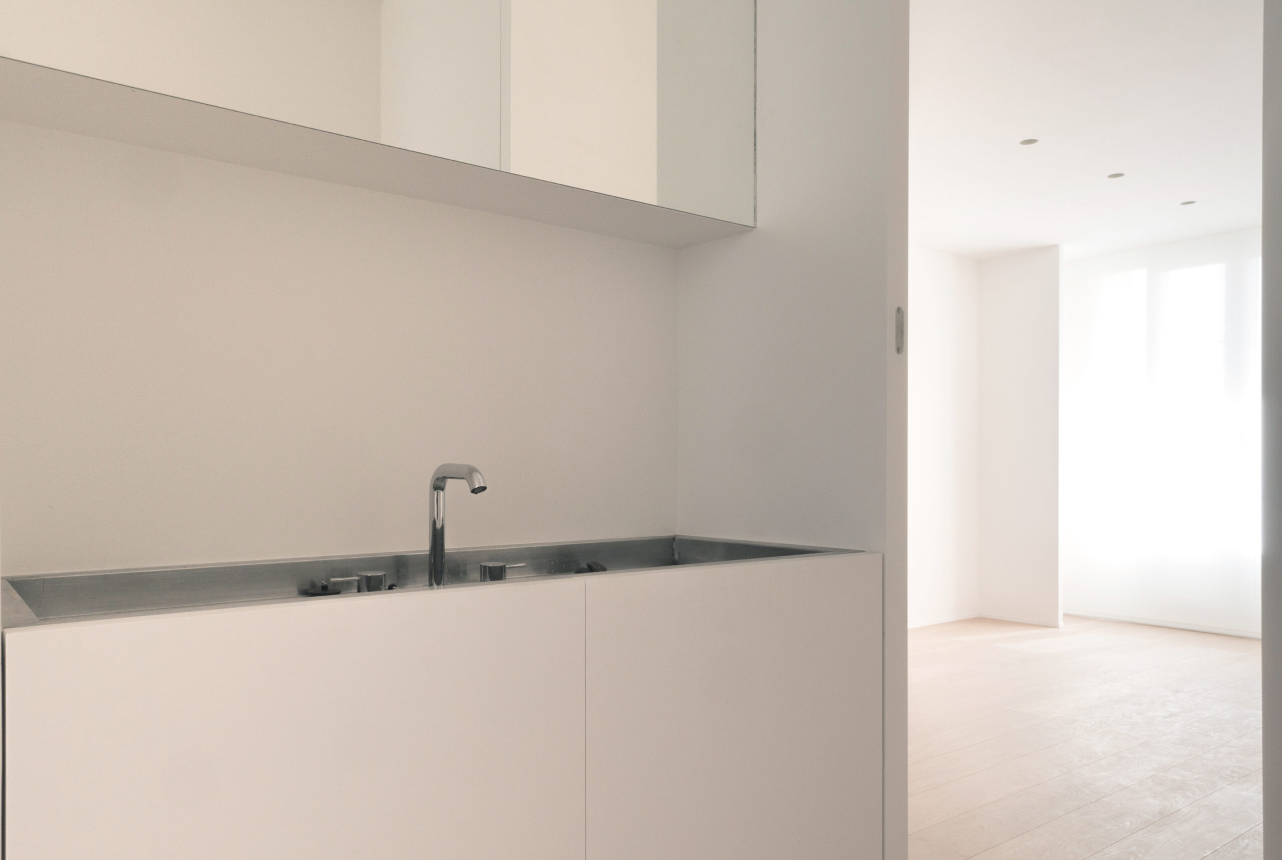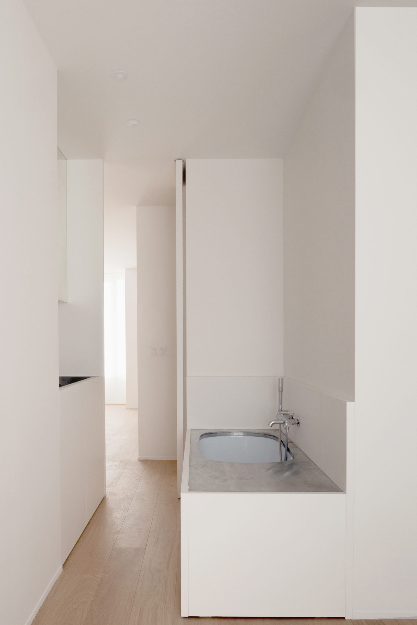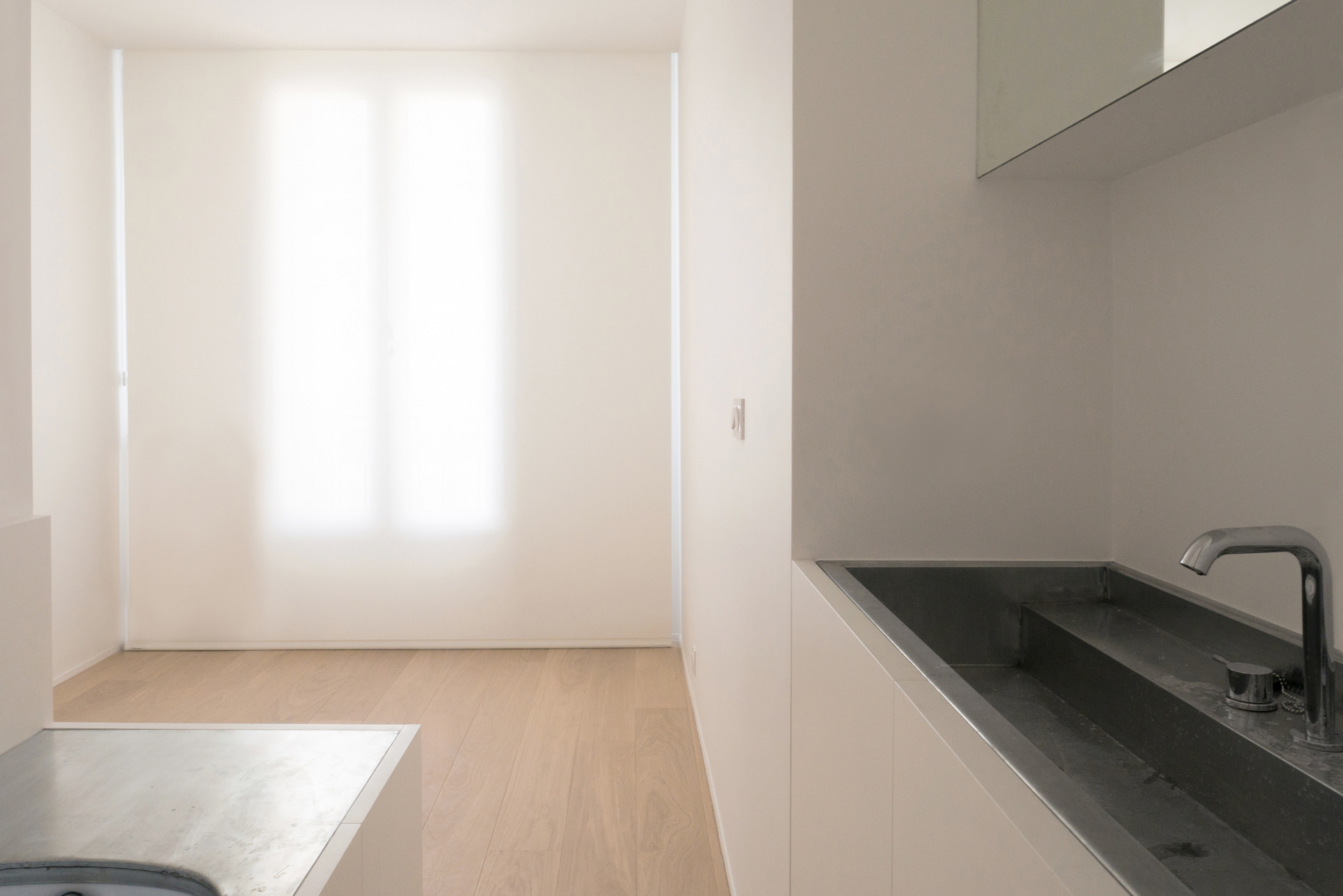 Situé au 6° étage d’un immeuble HBM en brique typique des années 30, l’appartement est conçu dans une volonté de simplicité et de précision. Le projet cherche à rendre tangible la présence d’une lumière naturelle de qualité en jouant sur la perception de l’espace fini. Il propose des pièces de vie ouvertes et fluides dans lequel les différentes fonctions de l’existant sont remaniées et l’appartement rendu entièrement traversant. Le mobilier est réalisé sur mesure et pensé comme des éléments de l’espace de vie qui ne répondent plus seulement aux rituels du bain ou du repas mais contribuent également à la mise en scène de l’espace.