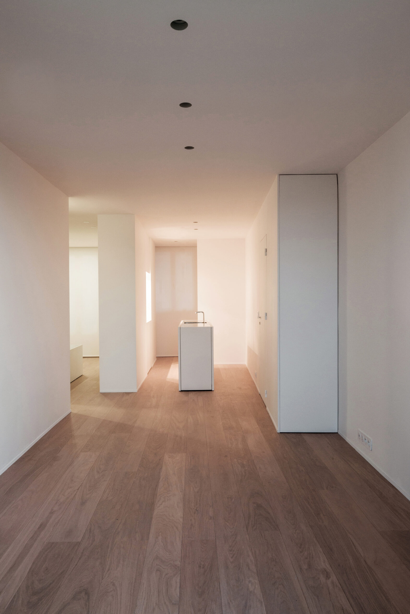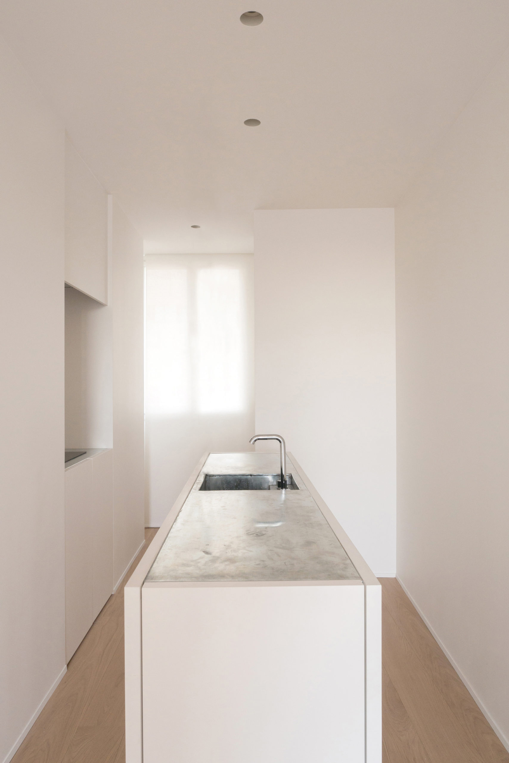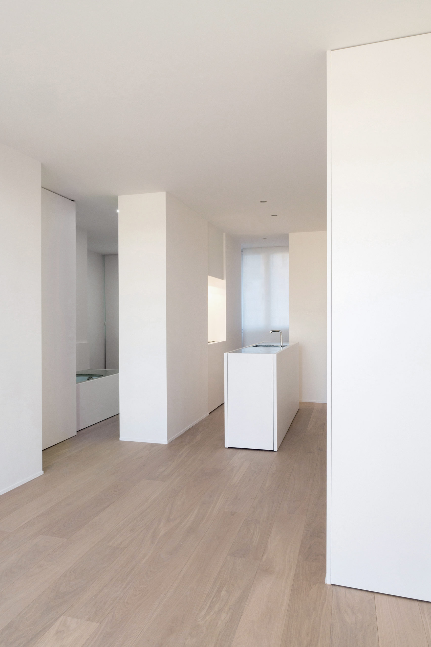 Situé au 6° étage d’un immeuble HBM en brique typique des années 30, l’appartement est conçu dans une volonté de simplicité et de précision. Le projet cherche à rendre tangible la présence d’une lumière naturelle de qualité en jouant sur la perception de l’espace fini. Il propose des pièces de vie ouvertes et fluides dans lequel les différentes fonctions de l’existant sont remaniées et l’appartement rendu entièrement traversant. Le mobilier est réalisé sur mesure et pensé comme des éléments de l’espace de vie qui ne répondent plus seulement aux rituels du bain ou du repas mais contribuent également à la mise en scène de l’espace.
