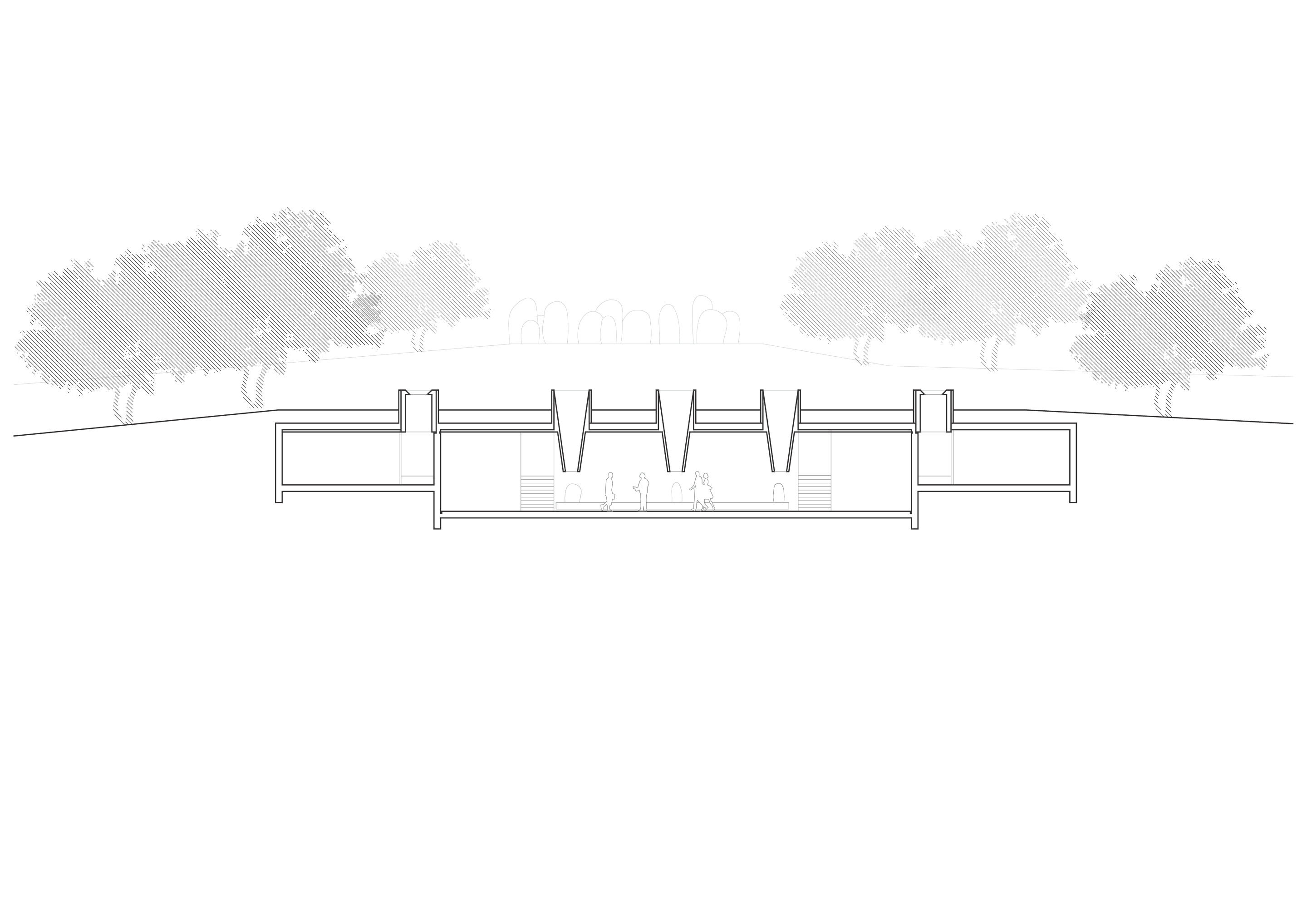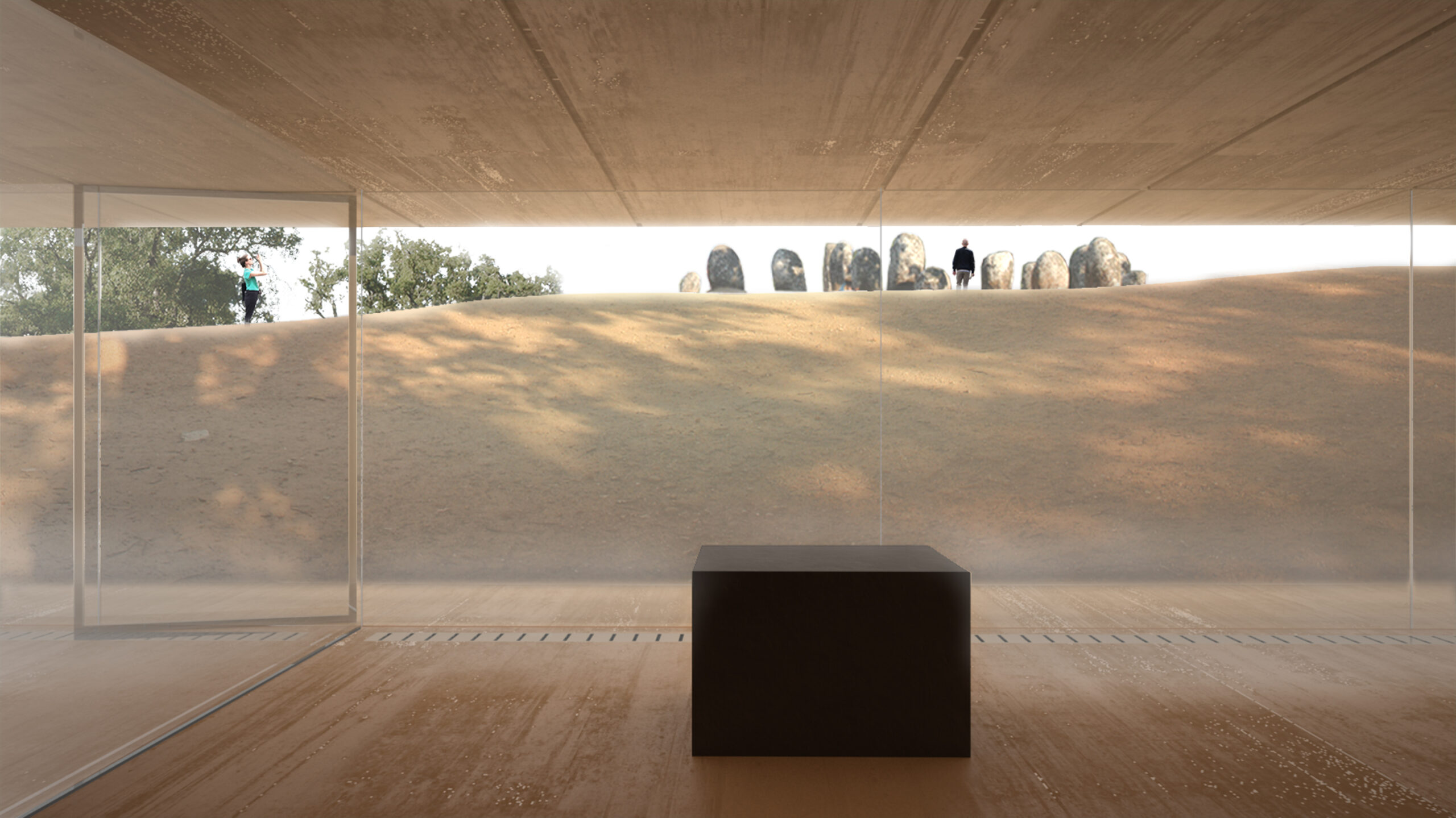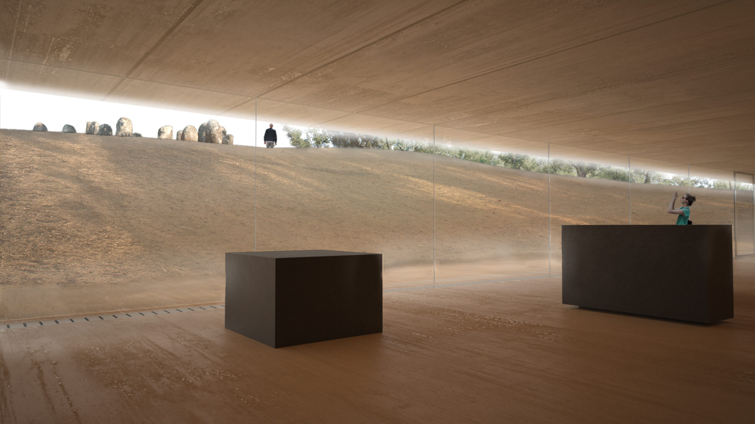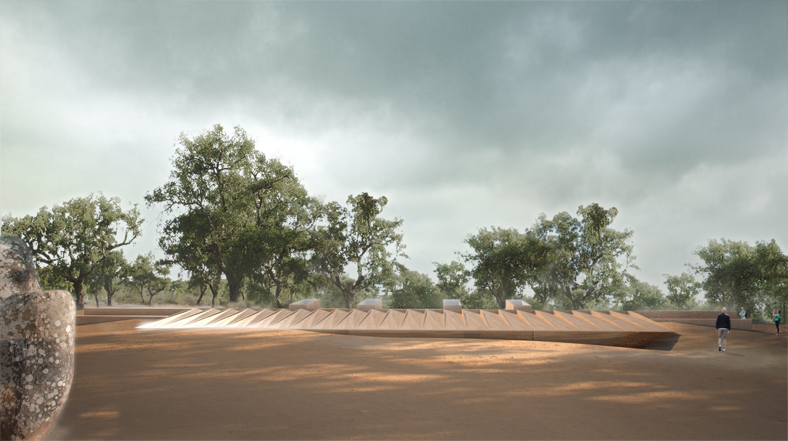 L’office de tourisme de Almendres se situe au cœur d’une oliveraie où a été découvert un cromlech qui compte parmi les plus anciennes formes d’établissement humain. La présence plus que millénaire de ces paysages et de ces constructions énigmatiques nous pousse à mettre l’accent sur le site plutôt que sur l’architecture. Celle-ci s’exprime alors dans une forme simple, quasi primitive dans le but d’offrir une expérience singulière auprès du visiteur. La construction tire sa matérialité du béton dont les teintes chaudes reprennent celles du sol de la colline, en écho à la force du complexe mégalithique. La toiture qui la recouvre est constituée de panneaux en BFUP posés en porte à faux en appui sur le voile central et liaisonnés au mur de soutènement. La morphologie de cette toiture se caractérise par le pli extérieur de chaque module, qui joue le rôle d’une poutre retroussée à hauteur variable.