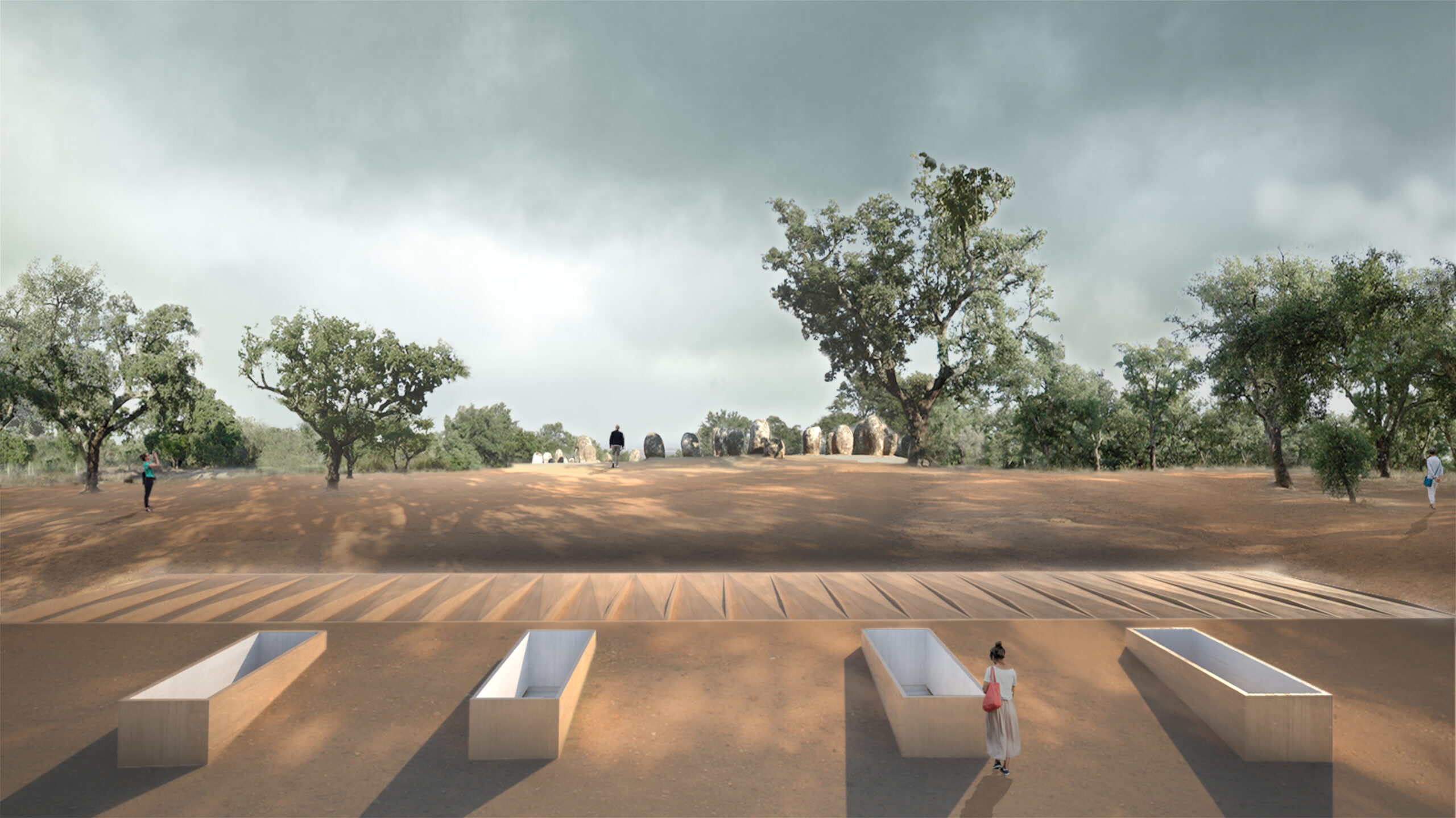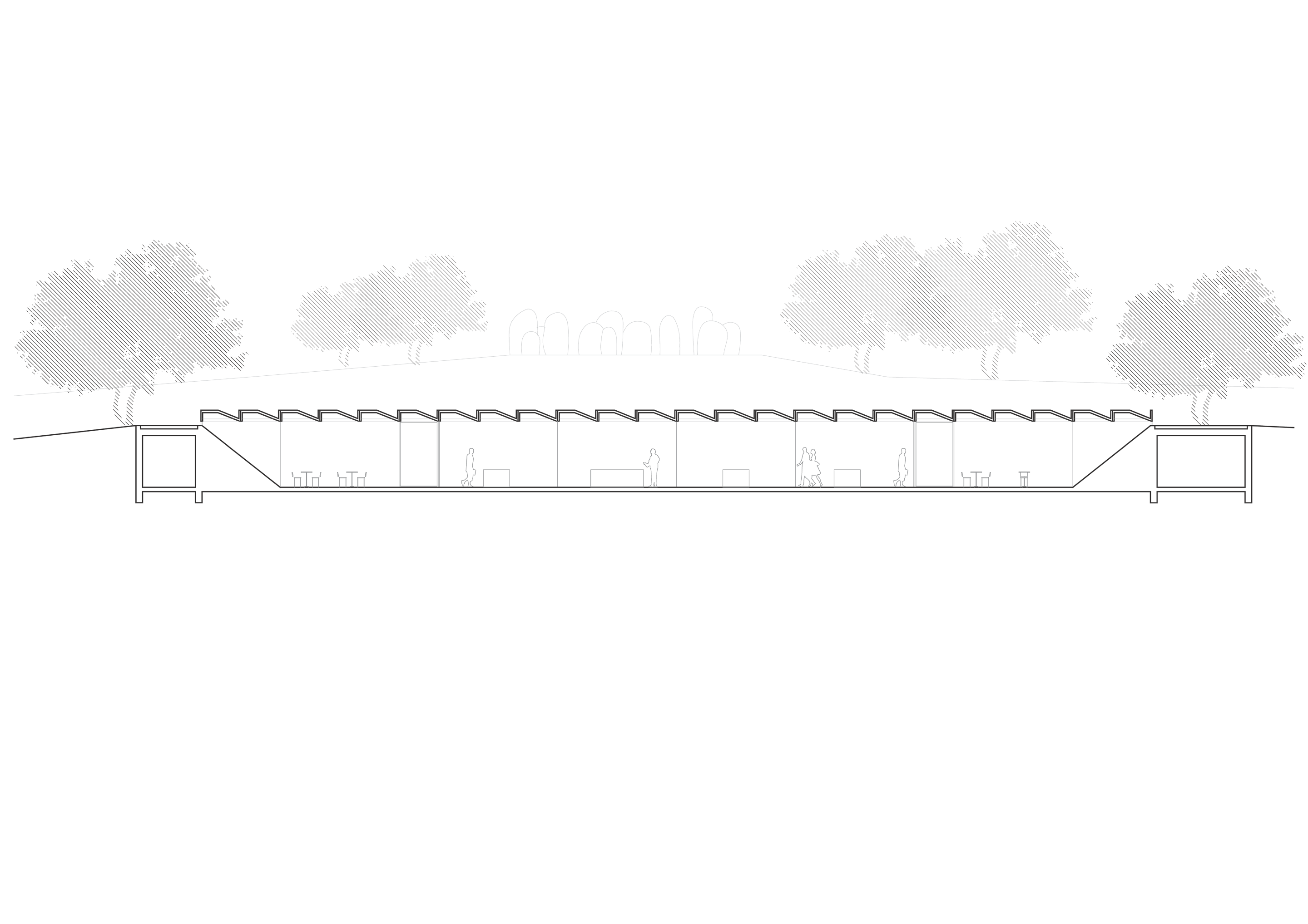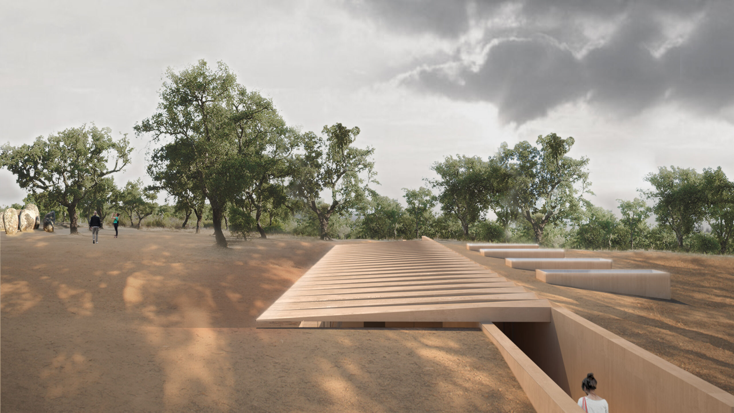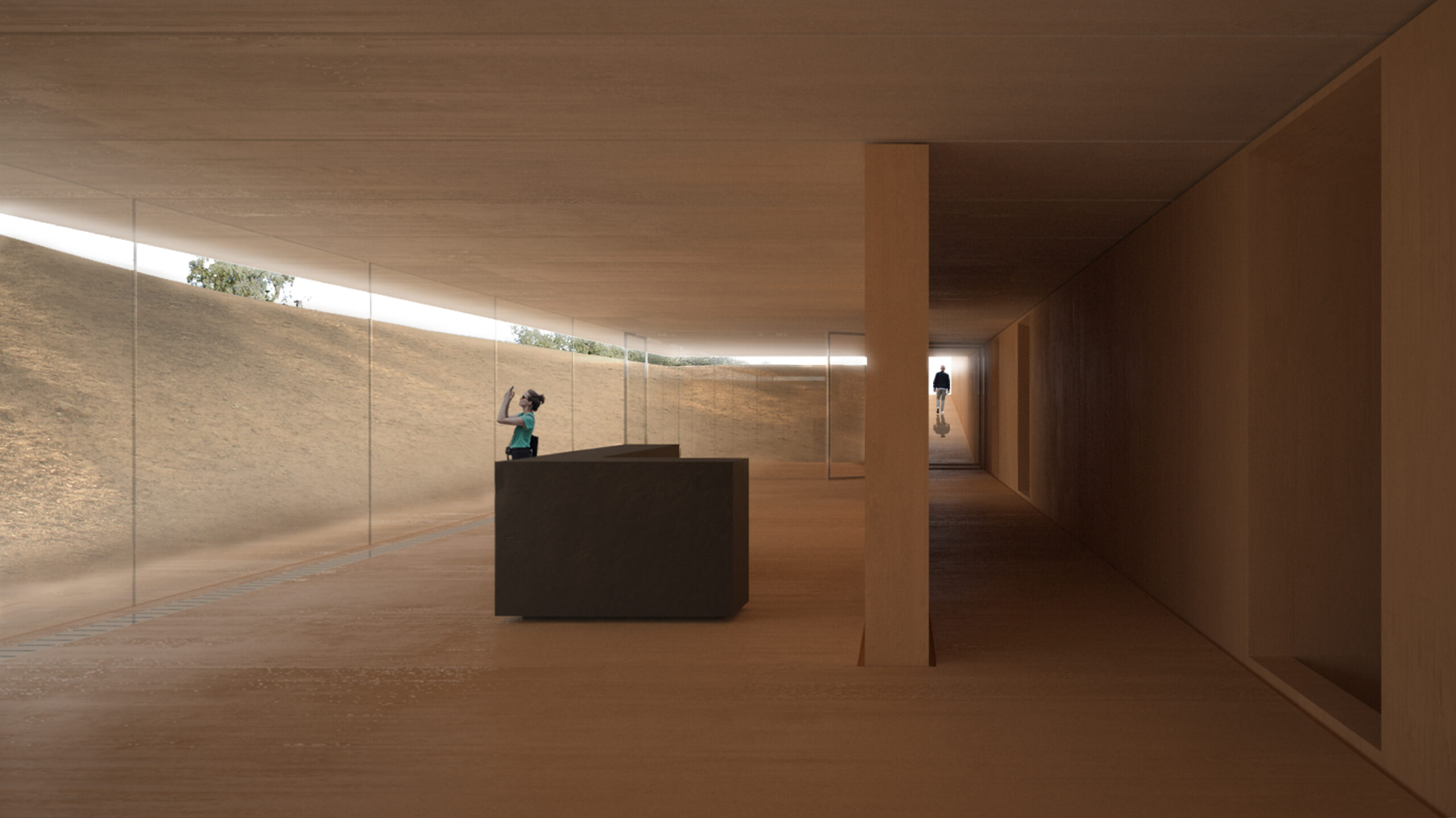 L’office de tourisme de Almendres se situe au cœur d’une oliveraie où a été découvert un cromlech qui compte parmi les plus anciennes formes d’établissement humain. La présence plus que millénaire de ces paysages et de ces constructions énigmatiques nous pousse à mettre l’accent sur le site plutôt que sur l’architecture. Celle-ci s’exprime alors dans une forme simple, quasi primitive dans le but d’offrir une expérience singulière auprès du visiteur. La construction tire sa matérialité du béton dont les teintes chaudes reprennent celles du sol de la colline, en écho à la force du complexe mégalithique. La toiture qui la recouvre est constituée de panneaux en BFUP posés en porte à faux en appui sur le voile central et liaisonnés au mur de soutènement. La morphologie de cette toiture se caractérise par le pli extérieur de chaque module, qui joue le rôle d’une poutre retroussée à hauteur variable.