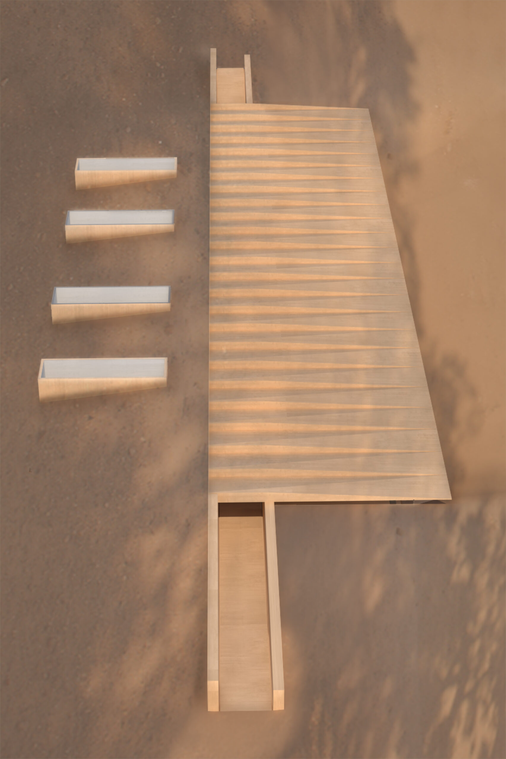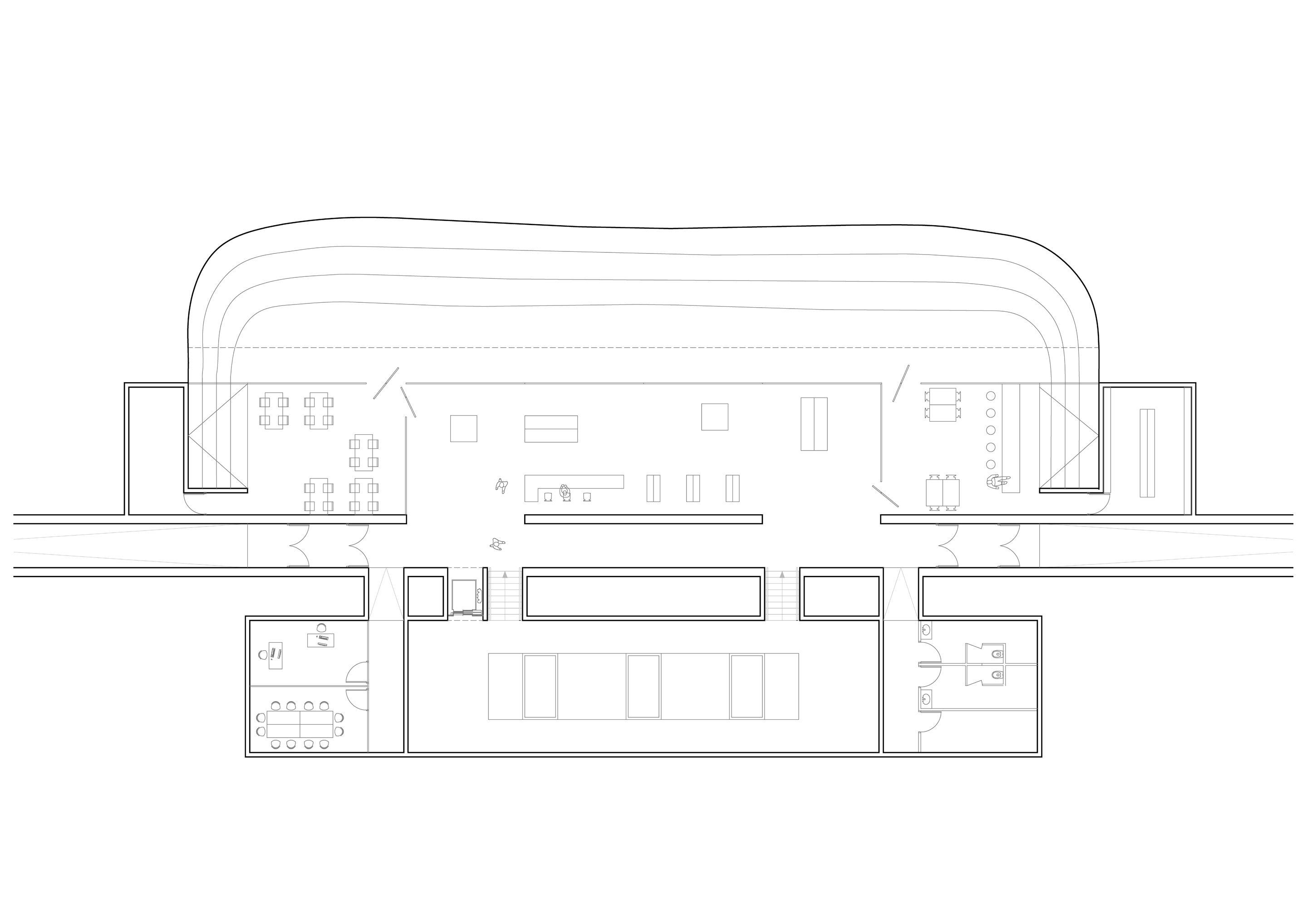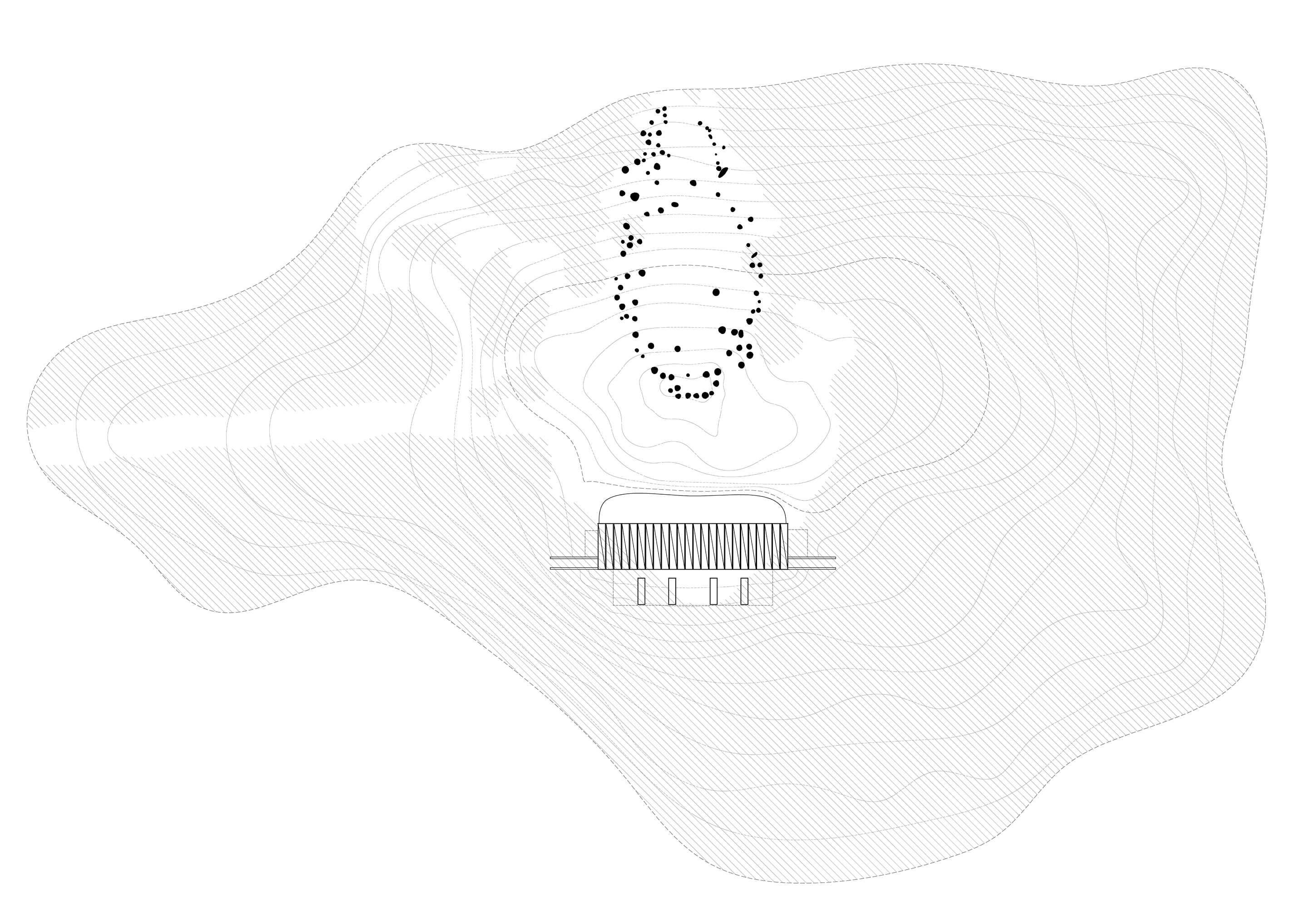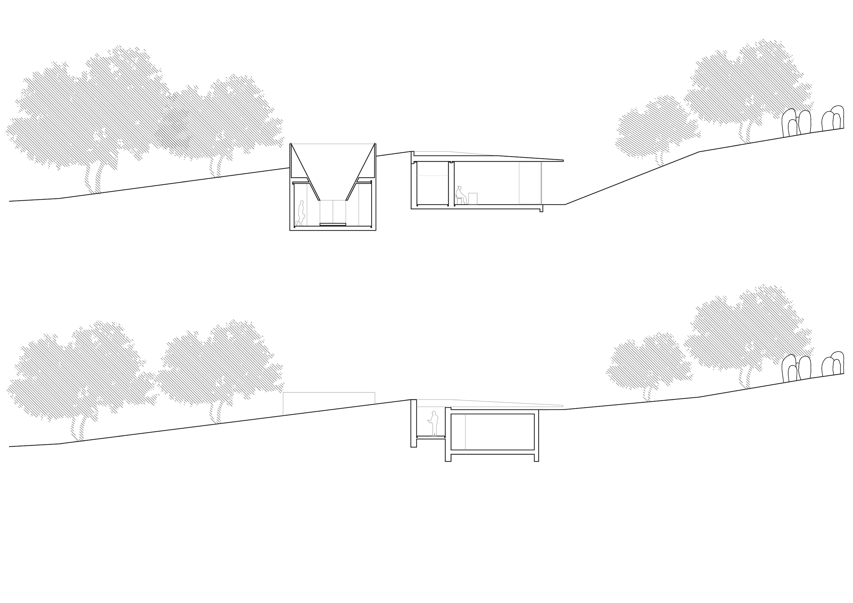 L’office de tourisme de Almendres se situe au cœur d’une oliveraie où a été découvert un cromlech qui compte parmi les plus anciennes formes d’établissement humain. La présence plus que millénaire de ces paysages et de ces constructions énigmatiques nous pousse à mettre l’accent sur le site plutôt que sur l’architecture. Celle-ci s’exprime alors dans une forme simple, quasi primitive dans le but d’offrir une expérience singulière auprès du visiteur. La construction tire sa matérialité du béton dont les teintes chaudes reprennent celles du sol de la colline, en écho à la force du complexe mégalithique. La toiture qui la recouvre est constituée de panneaux en BFUP posés en porte à faux en appui sur le voile central et liaisonnés au mur de soutènement. La morphologie de cette toiture se caractérise par le pli extérieur de chaque module, qui joue le rôle d’une poutre retroussée à hauteur variable.