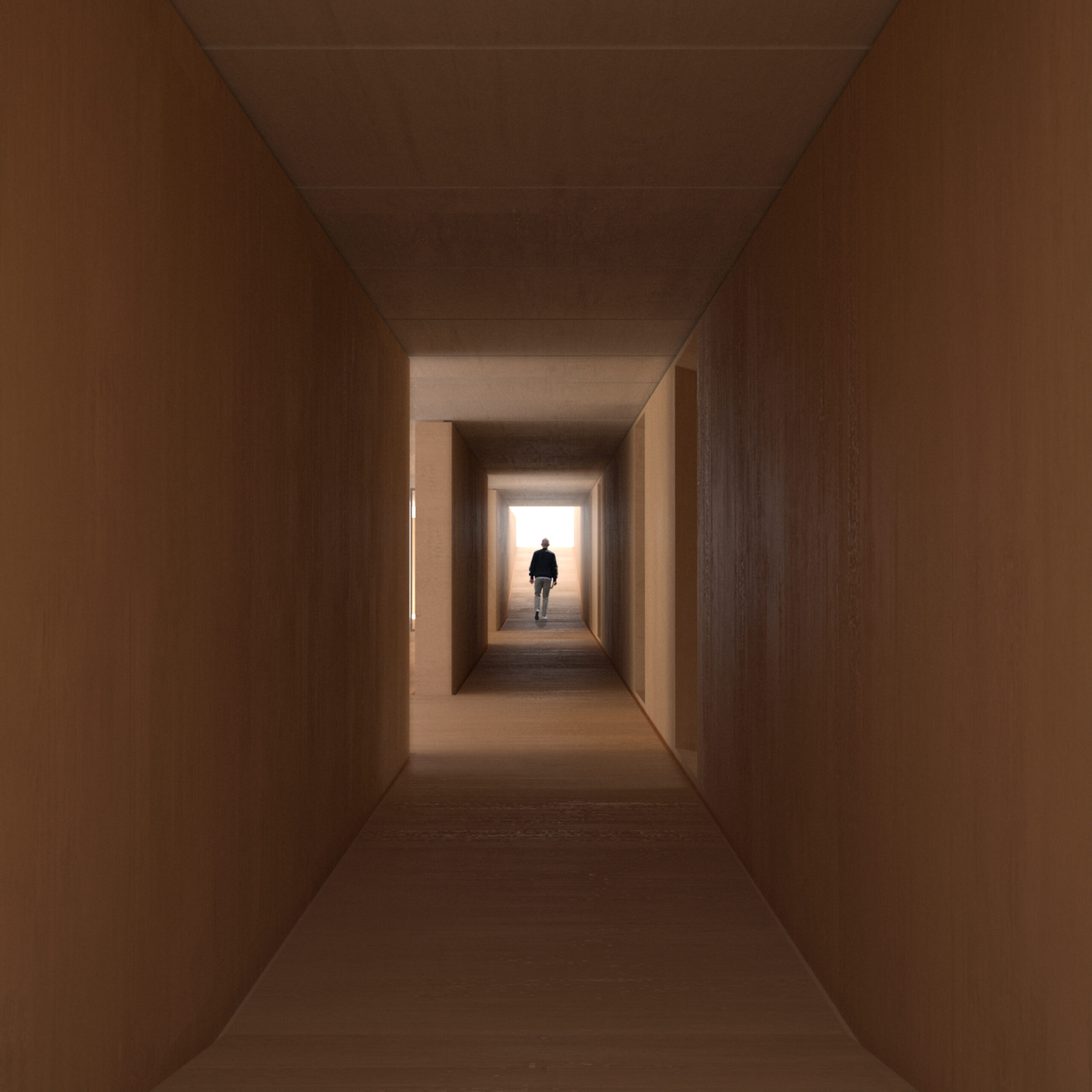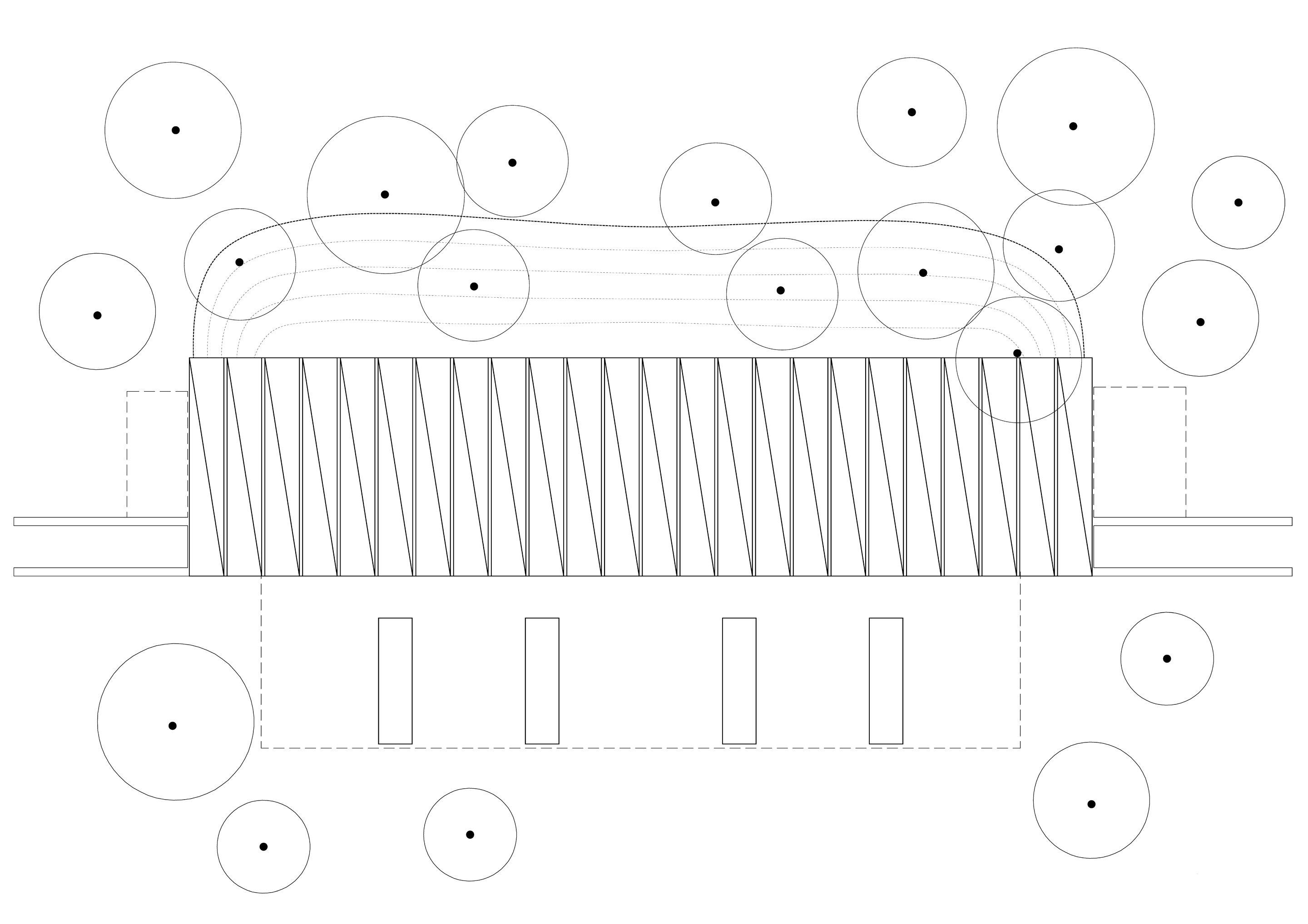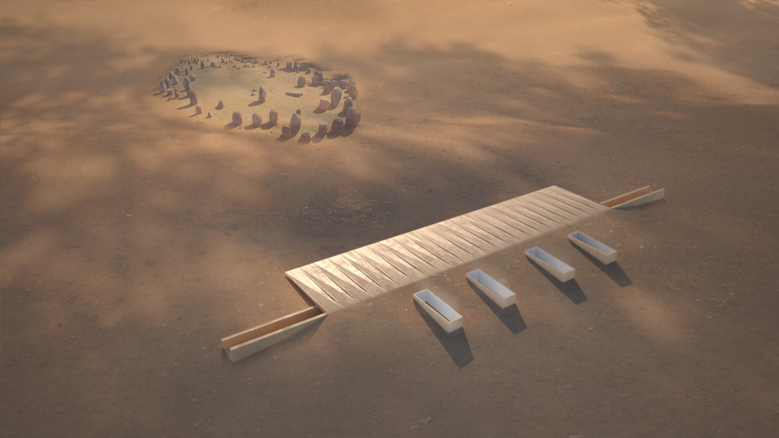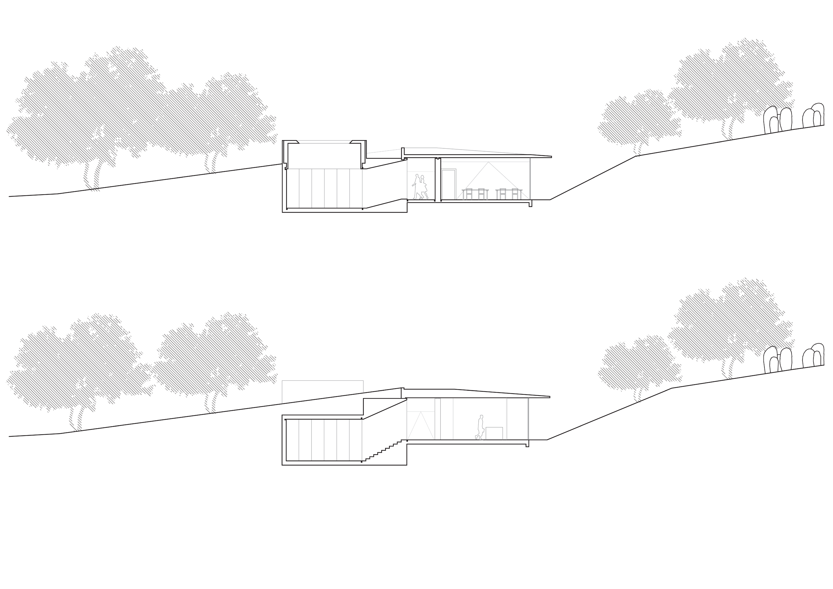 L’office de tourisme de Almendres se situe au cœur d’une oliveraie où a été découvert un cromlech qui compte parmi les plus anciennes formes d’établissement humain. La présence plus que millénaire de ces paysages et de ces constructions énigmatiques nous pousse à mettre l’accent sur le site plutôt que sur l’architecture. Celle-ci s’exprime alors dans une forme simple, quasi primitive dans le but d’offrir une expérience singulière auprès du visiteur. La construction tire sa matérialité du béton dont les teintes chaudes reprennent celles du sol de la colline, en écho à la force du complexe mégalithique. La toiture qui la recouvre est constituée de panneaux en BFUP posés en porte à faux en appui sur le voile central et liaisonnés au mur de soutènement. La morphologie de cette toiture se caractérise par le pli extérieur de chaque module, qui joue le rôle d’une poutre retroussée à hauteur variable.