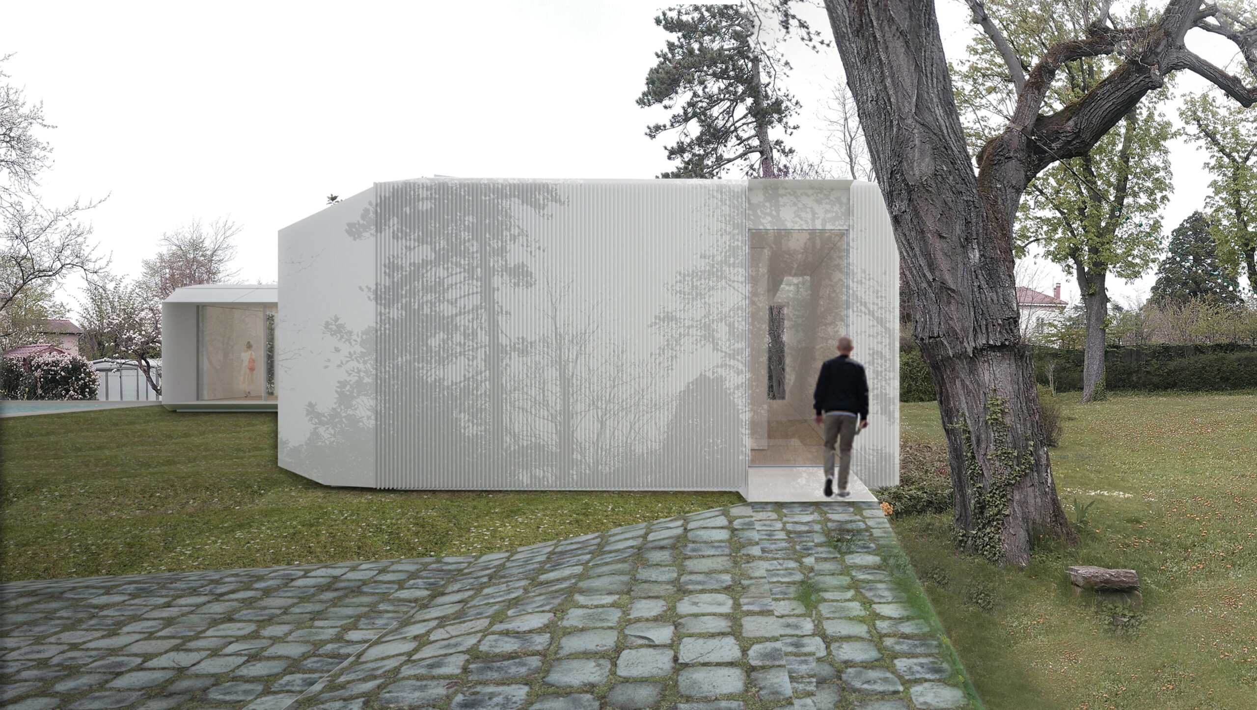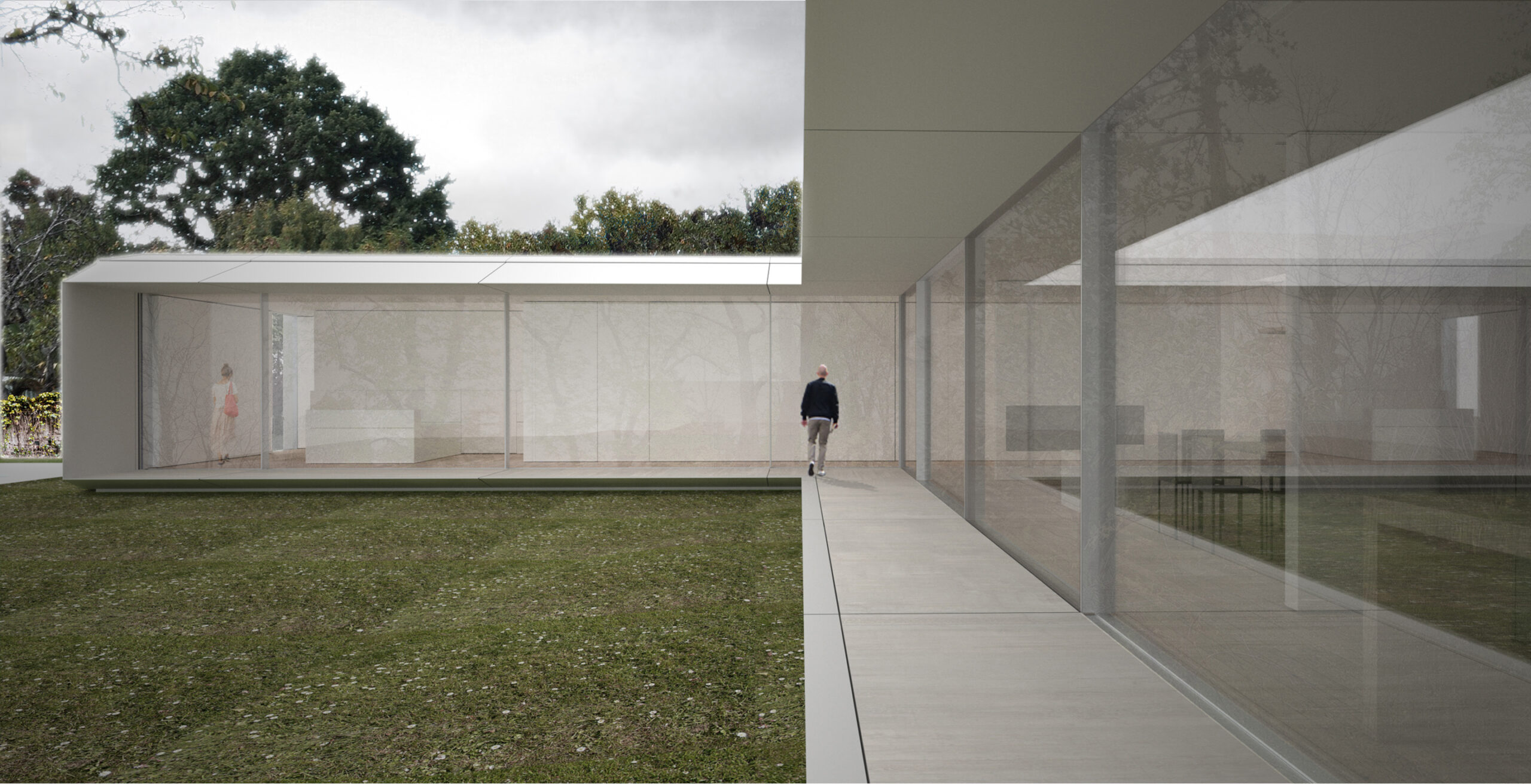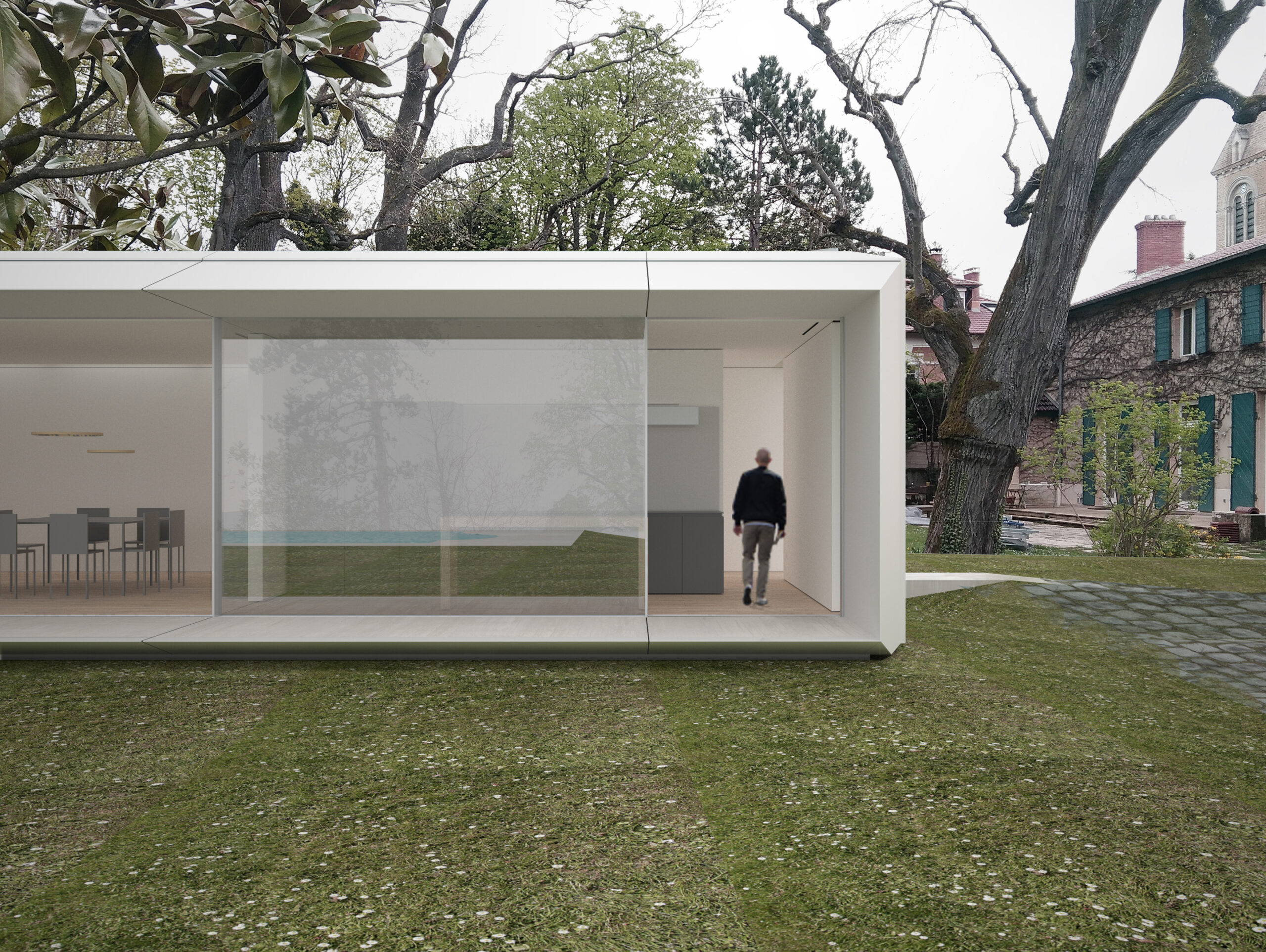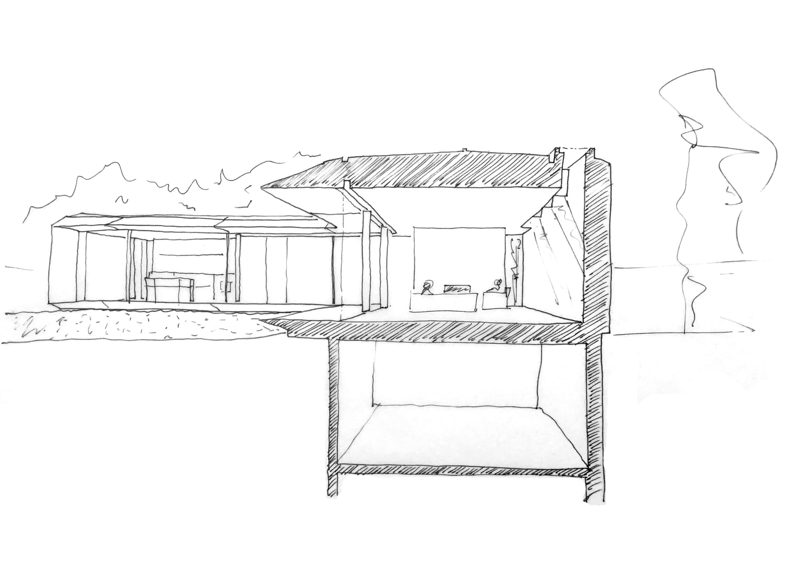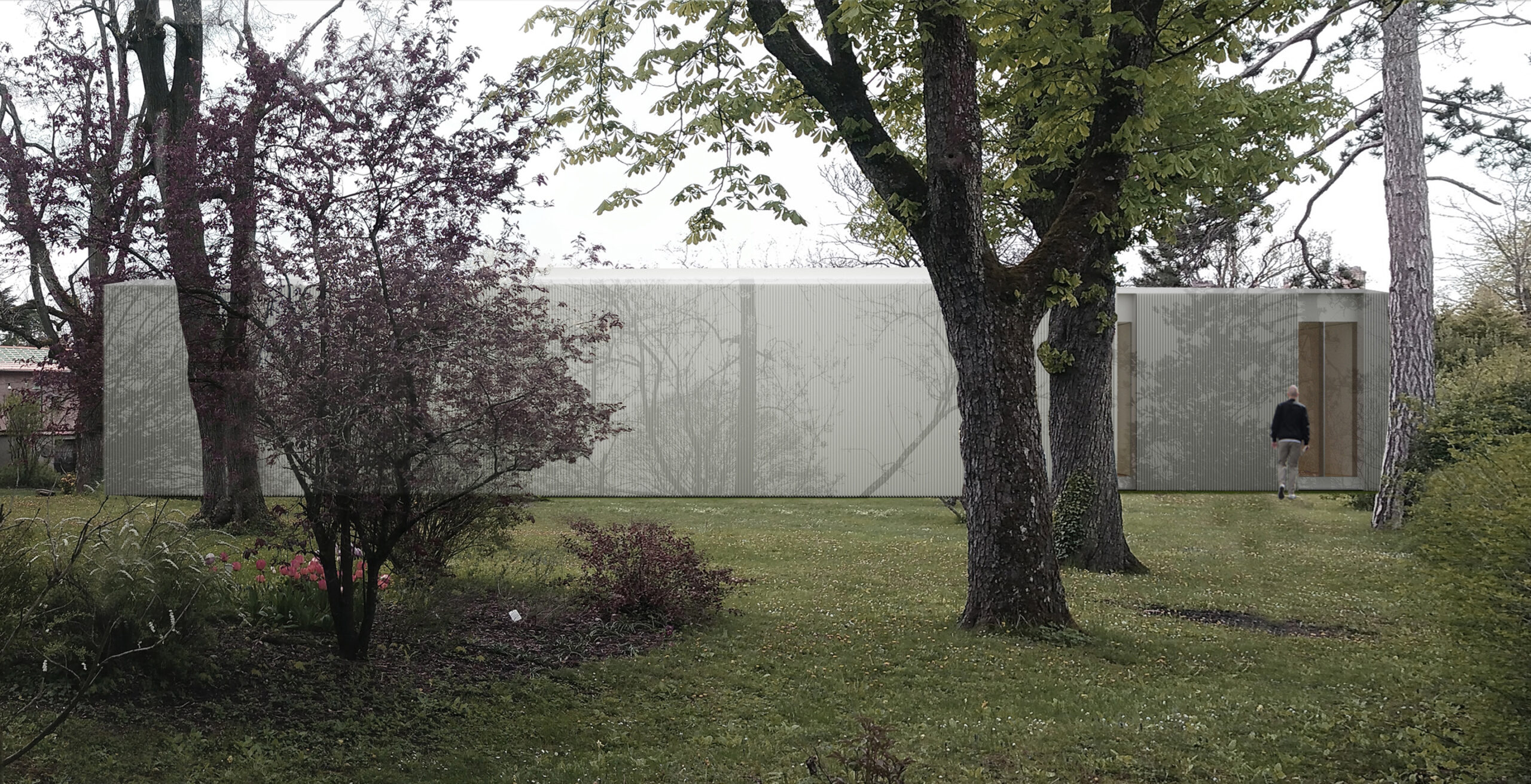 Une maison conçue comme un pavillon de jardin qui s’insère au cœur d’une propriété arborée marquée par caractère patrimonial des constructions et des arbres alentour. Implantée en limite de parcelle, elle prend la forme d’un « L » organisée autour d’un espace central orienté au Sud et à l’Ouest où l’ensemble du programme profite d’une lumière abondante. Attentive à la mise en valeur et la préservation de l’existant, la maison est construite avec un système préfabriqué composé d’une charpente métallique prolongée par un long cadre structurel en acier qui fonctionne à la fois comme un auvent et libère la façade de poteaux tout en apportant sa singularité au projet.